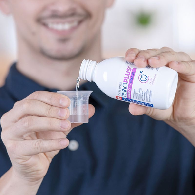 Perio Plus+ in druge ustne vode s CHX uporabljajte le po priporočilu svojega zobozdravnika. V normalnih okoliščinah ta izdelek ni potreben – zobne in medzobne ščetke zadostujejo za čiščenje zob, dlesni in ustne sluznice. Vedno upoštevajte navodila svojega zobozdravnika.