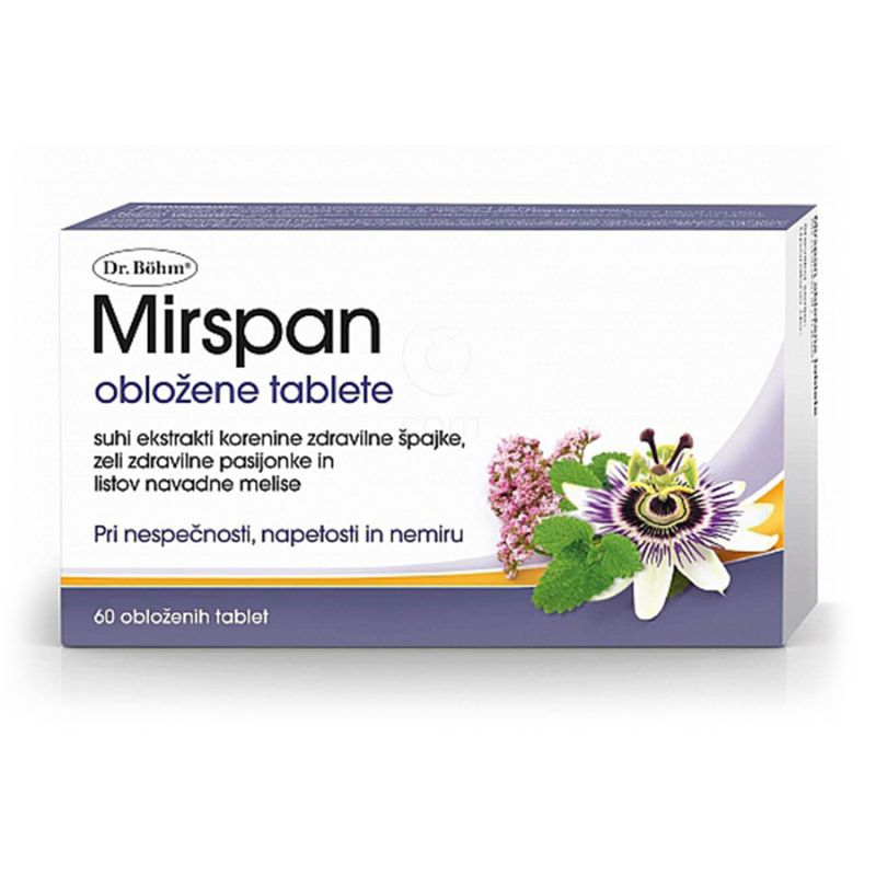 Zdravilo Mirspan je tradicionalno zdravilo rastlinskega izvora, ki vsebuje kombinacijo učinkovin treh zdravilnih rastlin: suhega ekstrakta korenine zdravilne špajke, suhega ekstrakta zeli zdravilne pasijonke in suhega ekstrakta listov navadne melise.