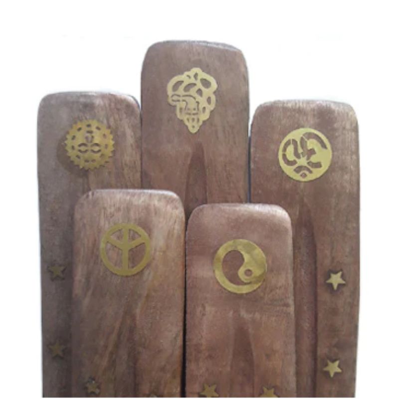 Podolgovat lesen podstavek za dišeče palčke z bakrenimi okraski.