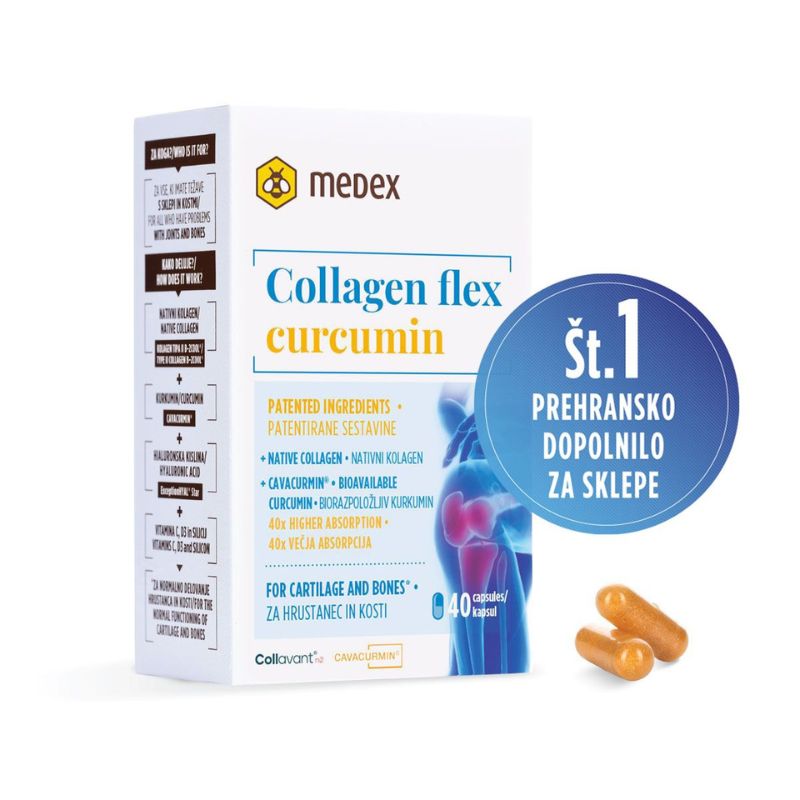 Collagen flex curcumin vsebuje nativni (nedenaturiranim) kolagen kurkumo, hialuronsko kislino, silicijem ter vitaminoma D in C za podporo normalnemu delovanju hrustanca in kosti.