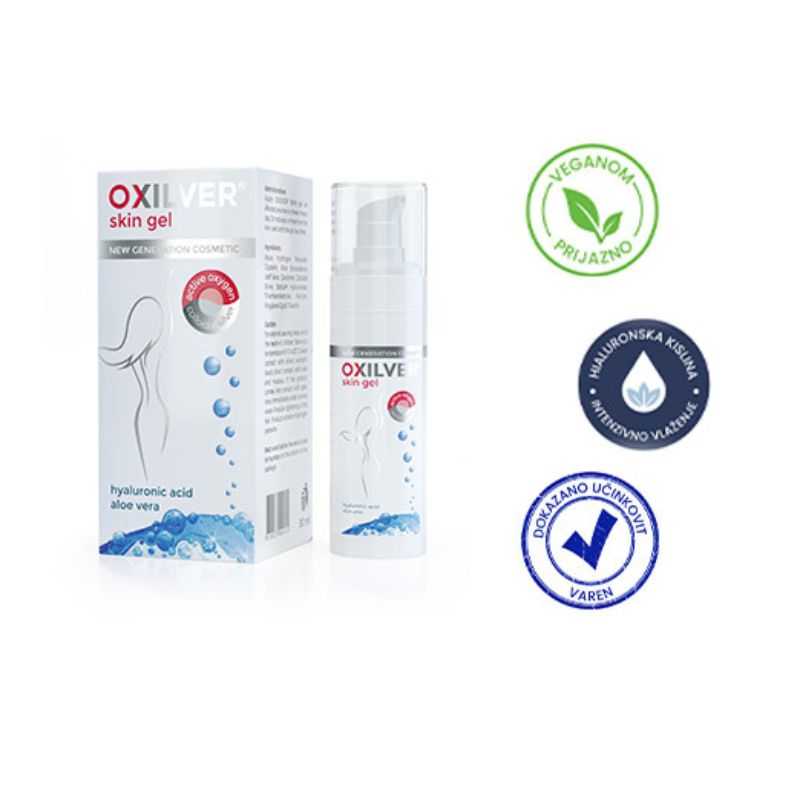 OXILVER® Skin gel je učinkovita in varna kozmetika osnovi aktivnih kisikovih spojin, namenjena za nego in pomoč pri težavah na koži. Ob stiku raztopine s kožo se sprosti aktivni kisik, ki v kombinaciji z ioniziranim srebrom, hialuronsko kislino in Aloe vero kožo oksigenira, regenerira, čisti, neguje in deluje blago antiseptično.