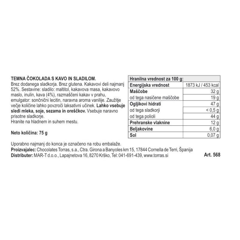 Temna čokolada Torras je brez dodanega sladkorja, laktoze, glutena in umetnih ojačevalcev okusa. Vsebuje kar najmanj 52 % kakavovih delov, poživi pa jo še dodatek aromatičnih kavnih zrn.