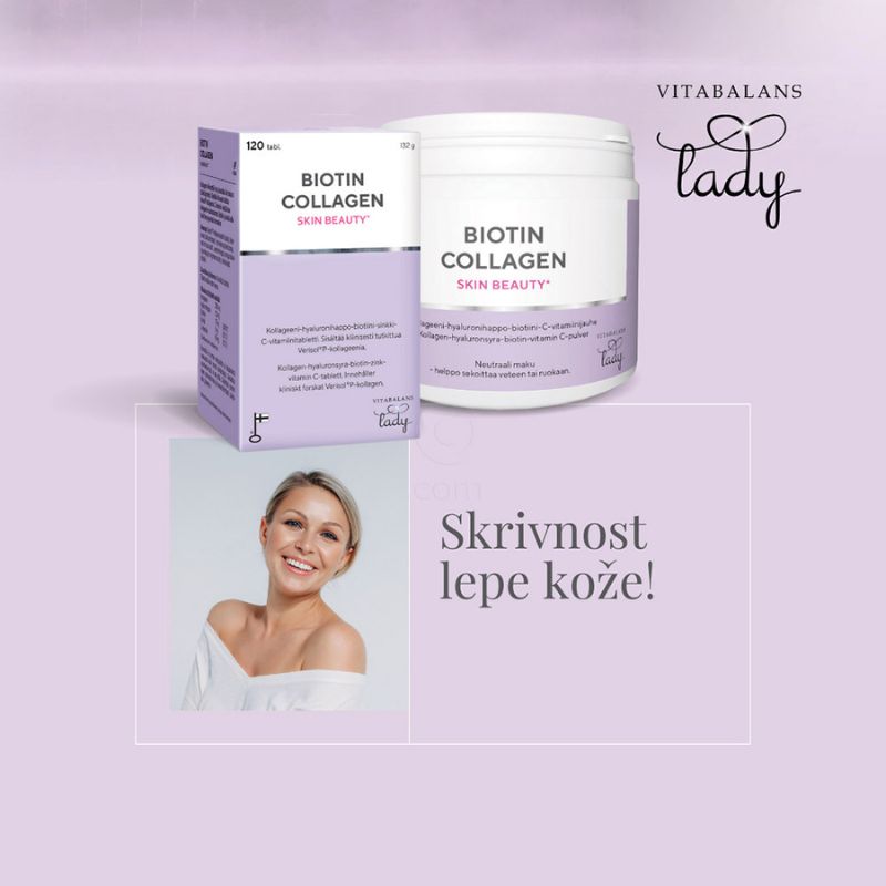 Vitabalans Biotin Collagen Skin Beauty vsebuje klinično testiran Verisol P kolagen, hidroliziran iz svinjskega kolagena, ki je po svoji sestavi najbližji kolagenu, ki se nahaja v koži človeka. Hidrolizirani kolagen se v telesu zlahka absorbira in ima visoko biološko uporabnost.
